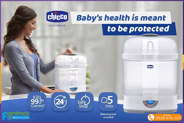 Máy tiệt trùng đa năng 3 in 1 Chicco cho phép tiết kiệm tới 25% thời gian và năng lượng.